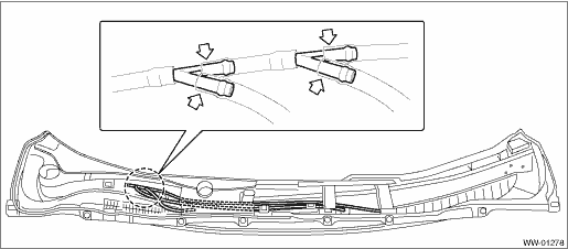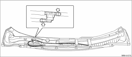 1. Disconnect the ground terminal from battery sensor. NOTE 2. Remove the arm assembly - windshield wiper. Front Wiper Arm > REMOVAL 3. Remove the cowl panel - side and the cowl panel assembly. Cowl Panel > REMOVAL CAUTION: Before removing the cowl panel, use an air blower and nylon brush to sweep gravel from the lower area of the front side of the glass. 4. Disconnect the hose - windshield washer. • Models without EyeSight