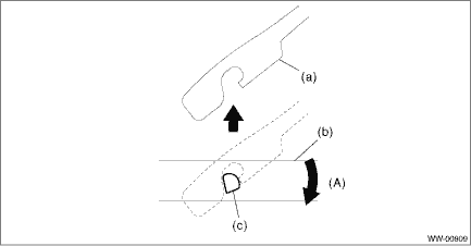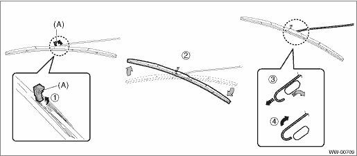 1. FRONT NOTE: Since the arm assembly - windshield wiper LH and RH can interfere with each other, remove the driver’s side first. 1. Lift up the locking clip (A). 2. Turn the blade assembly - windshield wiper in the arrow direction. 3. Push in the arm assembly - windshield wiper. 4. Pull out the arm assembly - windshield wiper while pulling it up, and remove the blade assembly - windshield wiper from the arm assembly - windshield wiper.
