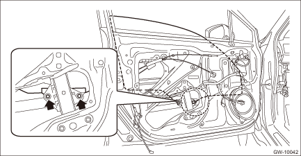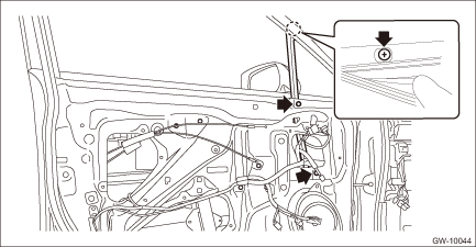 5. Connect the ground terminal to battery sensor. NOTE 6. Remove the glass assembly - front door. (1) Connect the switch - power window and then turn the ignition switch to ON. (2) Operate the switch - power window to move the glass assembly - front door to the position where the mounting bolts can be seen. (3) Remove the mounting bolts from the glass assembly - front door.