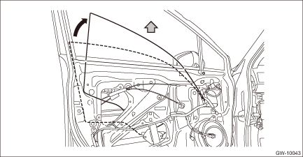 (4) While tilting the glass, remove the glass assembly - front door. CAUTION: Avoid impact and damage to the glass assembly - front door.