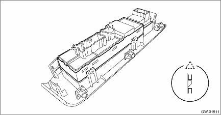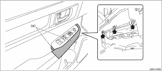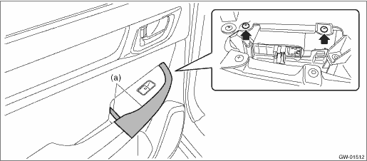 1. MAIN SWITCH 1. Disconnect the ground terminal from the battery sensor, and wait for at least 60 seconds before starting work. NOTE 2. Remove the trim panel - front door. Door Trim > REMOVAL 3. Remove the panel - power window main switch. CAUTION: Be careful not to damage the trim panel - front door with the panel - power window main switch. (1) Insert a sheet of protective paper (a) between panel - power window main switch and trim panel - front door. (2) Remove the screws.