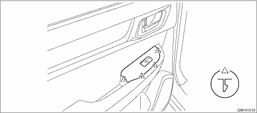 2. SUB-SWITCH Switch - power window sub front For removal of the switch - power window sub front on the passenger’s seat, refer to the removal procedure of the switch - power window main. Power Window Control Switch > REMOVAL Switch - power window sub rear 1. Disconnect the ground terminal from battery sensor. NOTE 2. Remove the trim panel - rear door. Door Trim > REMOVAL 3. Remove the panel - power window sub switch rear. CAUTION: Be careful not to damage the trim panel - rear door with the panel - power window sub switch rear. (1) Insert a sheet of protective paper (a) between panel - power window sub switch rear and trim panel - rear door. (2) Remove the screws.