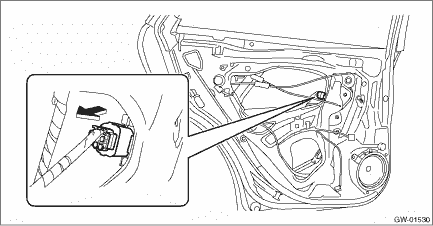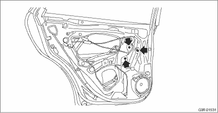 1. Disconnect the ground terminal from battery sensor. NOTE 2. Remove the trim panel - rear door. Door Trim > REMOVAL 3. Remove the sealing cover - rear door. 4. Remove the glass assembly - rear door. Rear Door Glass > REMOVAL 5. Remove the rear regulator and motor assembly. (1) Disconnect the connector of the motor - rear.