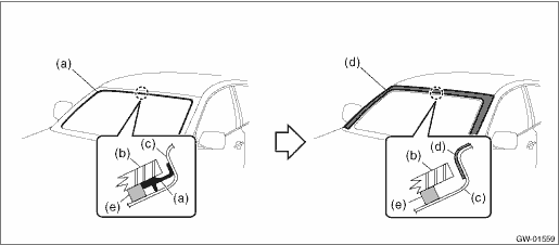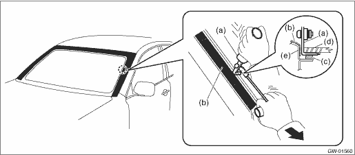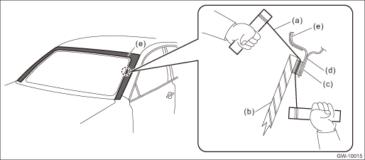 7. Remove the glass - front window. (1) Apply sufficient amount of soapy water to the adhesive part and insert the windshield glass knife. (2) While holding the edges of the knife and the glass - front window at a right angle, move the windshield glass knife parallel to the edge of the glass - front window, and cut the adhesive along the surface and the edge of the glass - front window. CAUTION: • Cutting of adhesive part should be started from an area with wider gap between the glass - front window and the body. • Never twist the windshield glass knife.