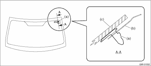 CAUTION: • For model with EyeSight, always remove the glass - front window after the stereo camera is removed. • For model with EyeSight, always use Subaru genuine windshield glass specially designed for EyeSight. (If the windshield glass other than the glass specially designed for EyeSight is used, the visibility of the camera is blocked or the distortion of the glass prevents the correct measurement of the object, resulting in the EyeSight abnormal operation.) • For model with EyeSight, if the windshield glass is installed after removal or replaced, always perform the “Inspection” and “Adjustment and check” of the stereo camera. Inspection: General Description > INSPECTION Adjustment and check: Camera Adjustment, Inspection • For model with EyeSight, if the damage is found in the glass repair prohibited area, always replace the glass. Damage in the prohibited area can affect the recognition of the stereo camera even if it is repaired, and thereby EyeSight function may not operate properly. 1. WHEN USING WINDSHIELD GLASS KNIFE 1. Disconnect the ground terminal from battery sensor. (Models with wiper deicer) NOTE 2. Remove the trim panel - front pillar UPR. Upper Inner Trim > REMOVAL 3. Remove the cowl panel assembly. Cowl Panel > REMOVAL 4. Remove the stereo camera cover and stereo camera. (Models with EyeSight) Stereo Camera > REMOVAL 5. Disconnect the wiper deicer connector. (Models with wiper deicer) 6. Remove the molding - front window from the glass - front window, and attach protective tape on the body side of the circumference of the glass - front window.