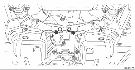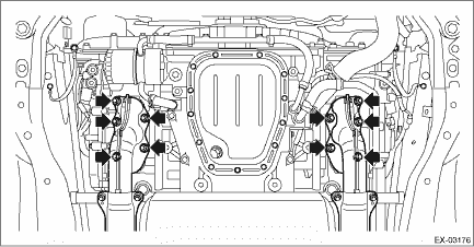 9. Remove the front exhaust pipe assembly from the vehicle body. CAUTION: • Be careful not to let the front exhaust pipe assembly fall off when removing, since it is very heavy. • After removing the front exhaust pipe assembly, do not apply excessive pulling force on the rear exhaust pipe. |
