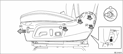 CAUTION: When removing the front seat, disconnect the ground cable from the battery before disconnecting the airbag system and the occupant detection system harness connector, and wait for 60 seconds before starting the operation. 1. POWER SEAT SWITCH 1. Remove the seat from vehicle. Front Seat > REMOVAL 2. Remove the cover - hinge front seat OUT. (1) Remove the screws in the rear section of the cover - hinge front seat OUT. (2) Release the claw in the upper section of the cover - hinge front seat OUT. NOTE: Use a plastic clip remover. (3) Remove the clip in the center of the cover - hinge front seat OUT. (4) Release the claw in the front section of the cover - hinge front seat OUT, then remove the cover - hinge front seat OUT.