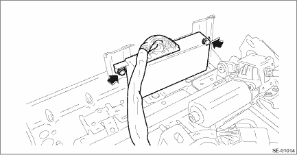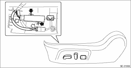 2. SEAT MEMORY SWITCH 1. Disconnect the ground terminal from the battery sensor, and wait for at least 60 seconds before starting work. NOTE 2. Remove the trim panel - front door. Door Trim > REMOVAL 3. Release the claws, and remove the seat memory switch assembly. 3. POWER SEAT CONTROL MODULE (SEAT WITH MEMORY FUNCTION) 1. Raise the seat cushion by operating the switch. 2. Remove the front seat from the vehicle. 3. Remove the power seat control module. (1) Release the hooks on seat front and turn over the cushion cover. (2) Remove the nuts, and remove the power seat control module.