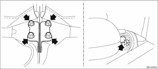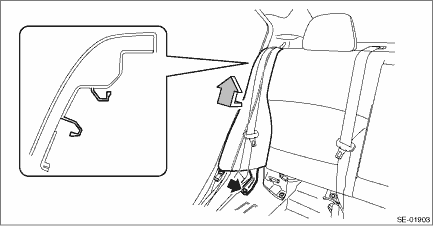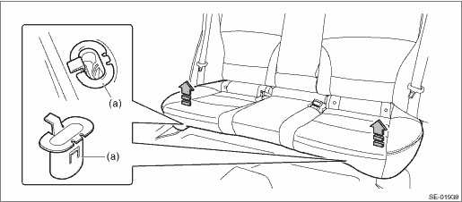 NOTE: The backrests cannot be detached while pin positions of the hinge assembly and backrests are not aligned. 5. Remove the bolts, and then remove each hinge assembly. 2. OUTBACK MODEL 1. Disconnect the ground terminal from the battery sensor, and wait for at least 60 seconds before starting work. NOTE 2. Remove the rear seat cushion. CAUTION: If the hook - rear seat (a) is disconnected from the vehicle body, make sure to replace the hook - rear seat with a new part to prevent the decline of the fixed force of the seat. (1) Pull up the seat cushion and release the hook - rear seat (a).