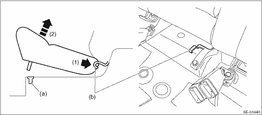 (2) Remove the hook (b) of the hinge assembly CTR by pushing it back while lifting the front side of the seat cushion, and remove the seat cushion.