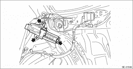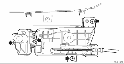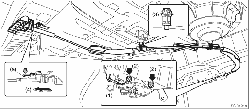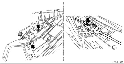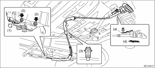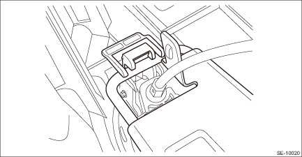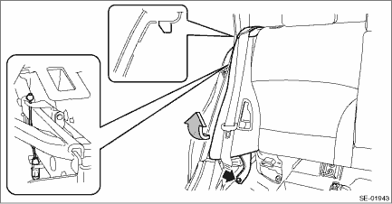 4. BACKREST TILT MECHANISM (OUTBACK MODEL) 1. Disconnect the ground terminal from the battery sensor, and wait for at least 60 seconds before starting work. NOTE 2. Remove the rear seat cushion. Rear Seat > REMOVAL CAUTION: If the hook - rear seat is disconnected from the vehicle body, make sure to replace the hook - rear seat with a new part to prevent the decline of the fixed force of the seat.