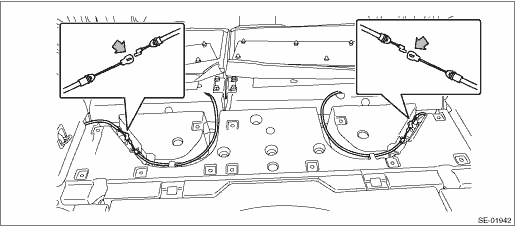6. Remove the rear backrest assembly, and remove the release button - rear backrest and the remote lever cable. Rear Seat > DISASSEMBLY 5. RECLINING MECHANISM (OUTBACK MODEL) 1. Disconnect the ground terminal from the battery sensor, and wait for at least 60 seconds before starting work. NOTE 2. Remove the rear seat cushion. Rear Seat > REMOVAL CAUTION: If the hook - rear seat is disconnected from the vehicle body, make sure to replace the hook - rear seat with a new part to prevent the decline of the fixed force of the seat.