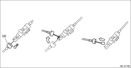 (3) Disconnect the reclining cable. (1) Remove the outer case (a). (2) Disconnect the striker cable through the cutout.