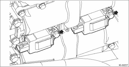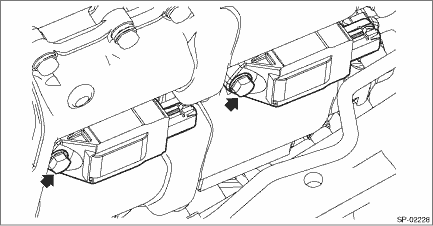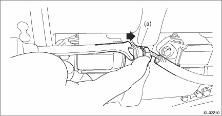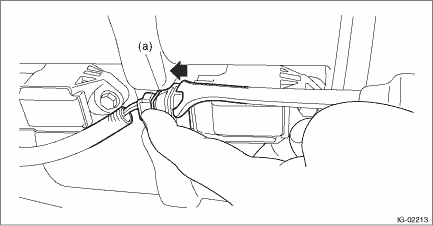 5. Remove the spark plug with a spark plug socket. 2. LH SIDE 1. Remove the battery. Battery > REMOVAL 2. Disconnect the connector from ignition coil. NOTE: While pressing the spring (a) shown in the figure, slide it in the direction of the arrow with a clip remover.