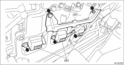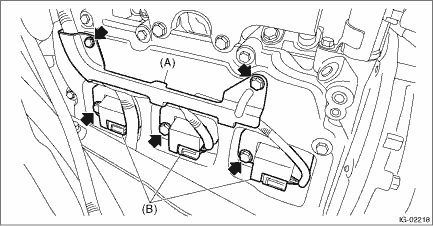 2. Remove the battery. Battery > REMOVAL 3. Remove the engine harness stay (A). 4. Disconnect the connector (B) from ignition coil. 5. Remove the ignition coil. NOTE: Turn the #6 ignition coil to remove it.