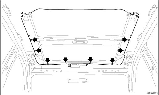 6. Remove the rail assembly - sunroof. (1) Remove the curtain airbag module. Curtain Airbag Module > REMOVAL (2) Remove the bolts and then remove the sunroof bracket.