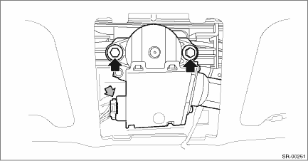 1. Disconnect the ground terminal from battery sensor. NOTE 2. Remove the overhead console. (Models without EyeSight) Spot Map Light > REMOVAL 3. Remove the stereo camera cover assembly. (Models with EyeSight) Stereo Camera > REMOVAL 4. Remove the motor assembly - sunroof. (1) Disconnect the harness connector. (2) Remove the bolt, and then remove the motor assembly - sunroof. CAUTION: When removing the motor assembly - sunroof, do not allow the cable assembly to move.