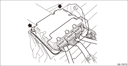 CAUTION: • Refer to “CAUTION” of “General Description” before handling the airbag system components. General Description > CAUTION • Do not disassemble the airbag control module. • If the airbag control module is deformed or if there is any trace of water on the module, replace the airbag control module with a new one. • Do not drop the airbag control module. • After removal, keep the airbag control module on a dry, clean surface away from moisture, heat and dust. 1. Turn the ignition switch to OFF. 2. Disconnect the ground terminal from the battery sensor, and wait for at least 60 seconds before starting work. NOTE NOTE: On CVT models, shift the select lever into “N” before disconnecting the battery ground cable. 3. Remove the cover - shift lever and the console box assembly. Console Box > REMOVAL 4. Remove the airbag control module. (1) Disconnect the connector from airbag control module. Airbag Connector > PROCEDURE (2) Remove the bolt and nuts and remove the airbag control module.