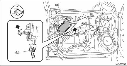 CAUTION: • Refer to “CAUTION” of “General Description” before handling the airbag system components. General Description > CAUTION • When the front door impact sensor is removed, always replace it with a new front door impact sensor. If it is reused, sealing capability on the contacting surface of door panel may be insufficient and impact pressure may not be detected correctly. 1. Operate the power window switch to close the front door glass. 2. Turn the ignition switch to OFF. 3. Disconnect the ground terminal from the battery sensor, and wait for at least 60 seconds before starting work. NOTE 4. Remove the trim panel - front door. (On the side where airbag door sensor is removed) Door Trim > REMOVAL 5. Remove the sealing cover. Front Sealing Cover > REMOVAL 6. Remove the front door impact sensor. CAUTION: If it is removed with an excessive force, the panel assembly - front door may be deformed. Also, if the clip is damaged, replace it with a new clip. (1) Remove the plate - door (a). (2) Remove the nuts and then remove the front door impact sensor. (3) Pull the lock arm (b) and disconnect the airbag connector to remove the front door impact sensor. Airbag Connector > PROCEDURE