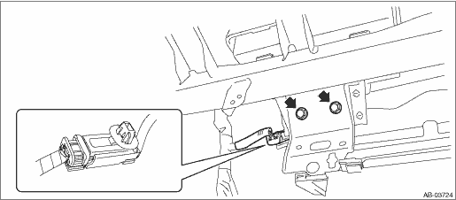 CAUTION: Refer to “CAUTION” of “General Description” before handling the airbag system components. General Description > CAUTION 1. Turn the ignition switch to OFF. 2. Disconnect the ground terminal from the battery sensor, and wait for at least 60 seconds before starting work. NOTE NOTE: • On CVT models, shift the select lever into “N” before disconnecting the battery ground cable. • For models with power seat, remove the slide rail installing bolt before disconnecting the ground terminal from the battery sensor. 3. Remove the front seats. Front Seat > REMOVAL 4. Remove the ornament panel - console, cover assembly - front, console box assembly and the panel center LWR. Console Box > REMOVAL 5. Remove the cover assembly - instrument panel LWR driver. Instrument Panel Lower Cover > REMOVAL 6. Remove the left and right grille speaker side and the trim panel - front pillar UPR. Upper Inner Trim > REMOVAL 7. Remove the glove box assembly. Glove Box > REMOVAL 8. Remove the center grille assembly. Air Vent Grille > REMOVAL 9. Remove the heater control assembly. Control Panel > REMOVAL 10. Remove the audio assembly or navigation assembly. Audio > REMOVAL 11. Remove the pocket assembly - CTR. External Connection Terminal > REMOVAL 12. Remove the panel - switch and combination meter assembly. Combination Meter > REMOVAL 13. Remove the keyless access CM. Keyless Access CM > REMOVAL 14. Disconnect the bolts and connectors of passenger’s airbag module. Airbag Connector > PROCEDURE