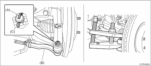 CAUTION: • Immediately after the vehicle has been running or after idling for a long time, the differential gear oil will be hot. Be careful not to burn yourself. • Be careful not to spill the differential gear oil on exhaust pipe to prevent it from emitting smoke or fire. If differential gear oil is spilled on the exhaust pipe, wipe it off completely. 1. Lift up the vehicle, and remove the front wheels. 2. After pulling off the cotter pin and removing the castle nut, use a puller to remove the tie-rod end.