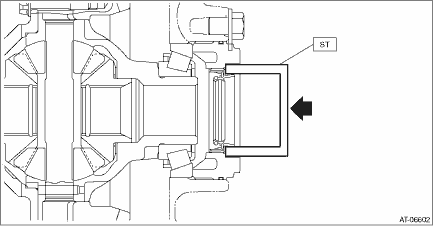 3. Lift up the vehicle. 4. Remove the under cover - front. 5. Remove the center exhaust pipe. Center Exhaust Pipe > REMOVAL 6. Drain differential gear oil. Differential Gear Oil > REPLACEMENT 7. Tighten the differential gear oil drain plug. NOTE: Use a new gasket. Tightening torque: 70 N·m (7.1 kgf-m, 51.6 ft-lb) 8. Remove the stabilizer link. Front Stabilizer > REMOVAL 9. Disconnect the ball joint and housing. 10. Pull out the front drive shaft from transmission using a crowbar. NOTE: Holding the joint of front drive shaft from transmission side, pull out the drive shaft from transmission with care not to stretch the boot. 11. Remove the differential side retainer oil seal using driver wrapped with vinyl tape etc. 12. Using the ST, install the differential side retainer oil seal by lightly tapping with a hammer. NOTE: • Apply differential gear oil to the lip surface, so that the oil seal lip is not deformed. • Apply differential gear oil to the press-fitting surface of oil seal and the differential side retainer. • Oil seal has an identification mark (R, L). When installing oil seals, do not confuse the left and right.