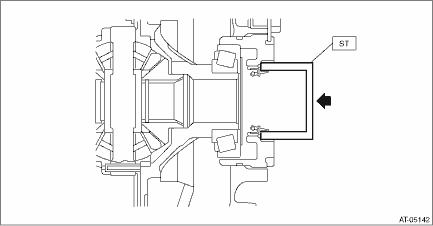 3. Lift up the vehicle. 4. Remove the front under cover. Front Under Cover > REMOVAL 5. Remove the front exhaust pipe. Front Exhaust Pipe > REMOVAL 6. Drain differential gear oil. Differential Gear Oil > REPLACEMENT 7. Tighten the differential gear oil drain plug. NOTE: Use a new gasket. Tightening torque: 70 N·m (7.1 kgf-m, 51.6 ft-lb) 8. Remove the stabilizer link. Front Stabilizer > REMOVAL 9. Disconnect the lower arm ball joint and housing. 10. Pull out the front drive shaft from transmission using a crowbar. 11. Holding the joint of front drive shaft from transmission side, pull out the drive shaft from transmission with care not to stretch the boot. 12. Remove the differential side retainer oil seal using driver wrapped with vinyl tape etc. 13. Using the ST, install the differential side retainer oil seal by lightly tapping with a hammer.