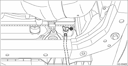 1. DRAINING OF ENGINE COOLANT 1. Lift up the vehicle. 2. Remove the under cover. Front Under Cover > REMOVAL 3. Connect a hose with inner diameter of φ8 mm (0.315 in) to the drain outlet of the radiator. 4. Loosen the drain plug to drain engine coolant into a container. NOTE: Remove the radiator cap so that engine coolant will drain faster.