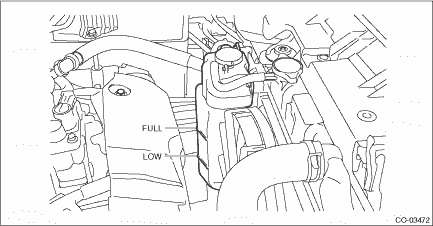 5. Tighten the drain plug. NOTE: Use new O-rings. 6. Remove the hose from the drain outlet of the radiator. 7. Install the under cover. Front Under Cover > INSTALLATION 2. FILLING OF ENGINE COOLANT CAUTION: For CVT models, set the select lever to “P” or “N” range (for MT models, the shift lever in neutral) during work, and do not shift the lever. 1. Pour cooling system conditioner through the filler neck. Cooling system protective agent: Refer to “SPECIFICATION” for cooling system protective agent. General Description > SPECIFICATION 2. Pour engine coolant into the radiator up to the filler neck position. Recommended engine coolant: Refer to “SPECIFICATION” for recommended engine coolant. General Description > SPECIFICATION Engine coolant level: Refer to “SPECIFICATION” for engine coolant level. General Description > SPECIFICATION Engine coolant concentration: Refer to “ADJUSTMENT” for the recommended engine coolant concentration. Engine Coolant > ADJUSTMENT NOTE: The SUBARU Super Coolant contains anti-freeze and anti-rust agents, and is especially made for Subaru engines with an aluminum cylinder block. Be sure to use SUBARU Super Coolant, since other coolant may cause corrosion. 3. Fill engine coolant into the reservoir tank up to “FULL” level.