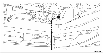 1. DRAINING OF ENGINE COOLANT 1. Lift up the vehicle. 2. Remove the under cover. Front Under Cover > REMOVAL 3. Connect a hose with inner diameter of φ8 mm (0.315 in) to the drain outlet of the radiator. 4. Loosen the drain plug to drain engine coolant into a container. NOTE: Remove the radiator cap so that engine coolant will drain faster.