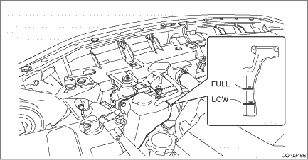 5. Tighten the drain plug. NOTE: Use new O-rings. 6. Remove the hose from the drain outlet of the radiator. 7. Install the under cover. Front Under Cover > INSTALLATION 2. FILLING OF ENGINE COOLANT CAUTION: During work, set the select lever to “P” or “N” range and do not shift the lever. 1. Pour cooling system conditioner through the filler neck. Cooling system protective agent: Refer to “SPECIFICATION” for cooling system protective agent. General Description > SPECIFICATION 2. Pour engine coolant into the radiator up to the filler neck position. Recommended engine coolant: Refer to “SPECIFICATION” for recommended engine coolant. General Description > SPECIFICATION Engine coolant level: Refer to “SPECIFICATION” for engine coolant level. General Description > SPECIFICATION Engine coolant concentration: Refer to “ADJUSTMENT” for the recommended engine coolant concentration. Engine Coolant > ADJUSTMENT NOTE: The SUBARU Super Coolant contains anti-freeze and anti-rust agents, and is especially made for Subaru engines with an aluminum cylinder block. Be sure to use SUBARU Super Coolant, since other coolant may cause corrosion. 3. Fill engine coolant into the reservoir tank up to “FULL” level.