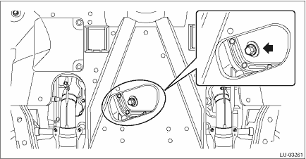 CAUTION: If the engine oil is spilt over exhaust pipe or the under cover, wipe it off with cloth to avoid emission of smoke or causing a fire. 1. Open the oil filler cap for quick draining of engine oil. 2. Lift up the vehicle. 3. Drain engine oil by loosening the drain plug. NOTE: Prepare the container for draining of engine oil.
