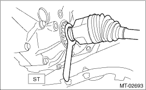 11. Remove the oil seal of the differential side retainer. NOTE: • Be sure to replace the oil seal after removing the front drive shaft from the transmission. • Use the ST 398527700 PULLER ASSY to remove the oil seal. If removing the oil seal with a flat tip screwdriver, be careful not to scratch the differential side retainer. 12. Using the ST, install the oil seal of the differential side retainer by lightly tapping with a plastic hammer. CAUTION: • Apply transmission gear oil to the oil seal lips, and install the oil seal while being careful not to deform the lip. • Check the identification marks (L, R) during installation not to mix up the oil seals RH and LH. NOTE: Use a new oil seal.