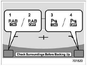 While the select lever is shifted to the "R" position, the below functions of the Reverse Automatic Braking system can be set by operating the audio/navigation monitor.