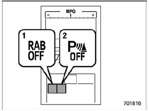 Braking When the ON setting key is shown, the corresponding setting is ON. Touch and hold the ON setting key to turn the setting OFF. When the OFF setting is shown, the corresponding setting is OFF. Touch and hold the OFF setting key to turn the setting ON. When the Reverse Automatic Braking system and/or the object detection warning beeping sounds are turned OFF, the following indicator(s) will illuminate.