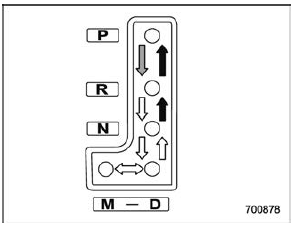 The select lever has four positions, "P", "R", "N", "D" and also has a manual gate for using the manual mode. NOTE For some models, to protect the engine while the select lever is in the "P" or "N" position, the engine is controlled so that the engine speed may not become too high even if the accelerator pedal is depressed hard. P (Park) This position is for parking the vehicle and starting the engine. In this position, the transmission is mechanically locked to prevent the vehicle from rolling freely. When you park the vehicle, first apply the parking brake, then shift into the "P" position. Do not hold the vehicle with only the mechanical friction of the transmission. To shift the select lever from the "P" to any other position, you should depress the brake pedal fully then move the select lever. This prevents the vehicle from lurching when it is started. R (Reverse) This position is for backing the vehicle. To shift from the "N" to "R" position, stop the vehicle completely then move the lever to the "R" position while pressing the select lever button in. When the ignition switch has been turned to the "LOCK"/"OFF" position, movement of the select lever from the "N" to "R" position is possible for a limited time period by depressing the brake pedal, and then it becomes impossible. For details, refer to "Shift lock function" . N (Neutral) This position is for restarting a stalled engine. In this position, the transmission is neutral, meaning that the wheels and transmission are not locked. Therefore, the vehicle will roll freely, even on the slightest incline unless the parking brake or foot brake is applied. Avoid coasting with the transmission in neutral. Engine braking has no effect in this condition.