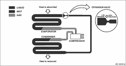 Item | Operation | Compressor | Sucks and pressurizes the low temperature, low pressure refrigerant gas that was vaporized at the evaporator by absorbing heat from the compartment, and sends the high temperature, high pressure refrigerant gas to the condenser. | Condenser | Cools the high temperature, high pressure refrigerant gas sent from the compressor for condense and liquefaction. | Expansion valve | • Sprays the high temperature, high pressure liquid refrigerant from the small hole in order to let the refrigerant expand rapidly to turn it into low temperature, low pressure mist. • The refrigerant amount is adjusted according to the refrigerant vaporization condition in the evaporator. | Evaporator | The evaporator turns into a low temperature condition when the mist refrigerant that was turned into a low temperature, low pressure condition at the expansion valve is vaporized in large quantity in the evaporator. Passing air flow through the low temperature evaporator emits cold air. |