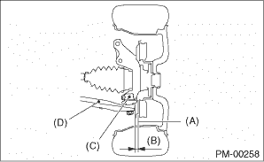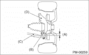 3. Next, grasp the end of front arm (C) and move it up and down. If movement (A) between the housing (D) and front arm (C) boss is observed, ball joint (B) may be excessively worn.