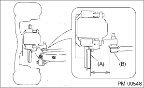 2. REAR SUSPENSION BALL JOINT 1. Lift up the vehicle until rear wheels are off ground. 2. Grasp the bottom of tire and move it in and out in axial direction. 3. If movement is observed between the brake disc cover (A) and end of front lateral link (B), ball joint may be excessively worn.