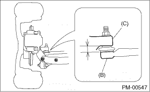 4. Grasp the end of front lateral link (B) and move it up and down. If movement is observed between the housing (C) and front lateral link (B) boss, ball joint may be excessively worn.