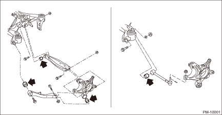 4. WHEEL ARCH HEIGHT Refer to “FS” section for wheel arch height inspection. Wheel Alignment > INSPECTION 5. WHEEL ALIGNMENT Measure and adjust the front and rear wheel alignment at a time. Refer to “FS” section for measurement and adjustment of wheel alignment. Wheel Alignment > INSPECTION 6. OIL LEAKAGE OF STRUT AND SHOCK ABSORBER Visually inspect the front strut and rear shock absorber for oil leakage. Replace the front strut and rear shock absorber if oil leaks excessively. 7. TIGHTNESS OF BOLTS AND NUTS Check the bolts and nuts for looseness. Retighten the bolts and nuts to specified torque. If the self-locking nuts and bolts are removed, replace them with new parts. General Description General Description 8. DAMAGE TO SUSPENSION PARTS Check the following parts and the fastening portion of the vehicle body for deformation or excessive rusting which impairs the suspension. Thoroughly remove the deposits of the lower spring seat of strut where dust or mud are likely piled up. If necessary, replace the damaged parts with new parts. If minor rust formation, pitting, etc. are noted, remove the rust and take rust prevention measure. • Front suspension • Front arm • Cradle • Strut • Rear suspension • Sub frame • Front lateral link • Rear lateral link • Upper arm • Trailing link • Shock absorber • In the area where salt is sprayed to melt snow on a road in winter, check suspension parts for damage caused by rust every 12 months after lapse of 60 months. Take rust prevention measures as required. |